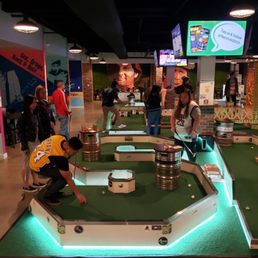 Super fun if you like mini golf!! They also have promotional packages that you can ask about. Unsure if it's for only large parties but I came with a large party and they had a promotional package for 2 hours at a reserve table. You can play all you want however many games and unlimited premade drinks. They are all on tap and premixed, so there isn't any substitutions or anything. And the tall shooters are not part of the promo. The employees were super knowledgeable and nice and you didn't wait long for anything. Upstairs is a speakeasy called The Trophy Room. Has a very nice up class feel to it. But it definitely isn't a dive or regular bar. I just got 2 shots of well vodka for $11 each. Definitely loved the vibe but I felt I could have gotten my drink somewhere cheaper. You're definitely paying for an experience here not just a drink. Was a fun outing all in all and would consider coming back for a date night as a splurge.